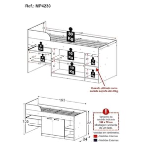 Prateleiras: Suportam até 4kg cada e podem ser utilizadas como escada (suporta até 40kg).