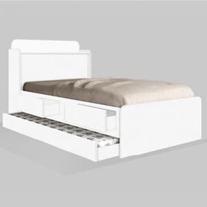 A cama possui baú e gavetas