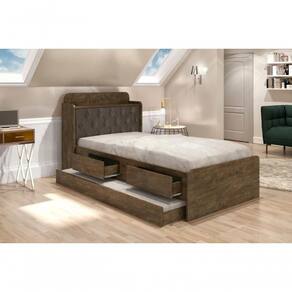 A cama possui baú e gavetas