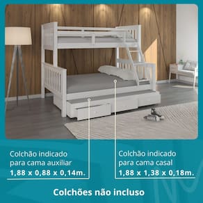 Funcionalidade: Inclui gavetas amplas para armazenamento, uma cama auxiliar com rodízios para maior praticidade e uma escada fixa para fácil acesso às camas superiores.