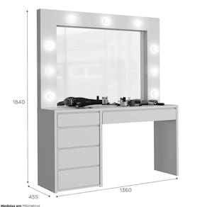 Camarim Anne 5 Gavetas 9 Lâmpadas LED MavaularDimensões do produto montado:Altura: 184 cmLargura: 136 cmProfundidade: 45,5 cmPeso: 74,8Características:Marca: MavaularModelo: Anne05 gavetasParte superior em mdf 15 mmTampo e laterais em mdp 25mmCorrediça telescópica de 35 mmPorta joias09 lâmpadas led Bivolt alternadas entre quente e friaInterruptor com tomada embutidoItens inclusos: 1 Camarim Anne 5 Gavetas 9 Lâmpadas LED MavaularInformações importantes:- Não nos responsabilizamos pela montagem e instalação dos produtos. A montagem deve ser realizada por um profissional, conforme as instruções do manual do produto. A responsabilidade da montagem é do consumidor.- Os Objetos que ambientam as imagens não acompanham o produto.- Pode haver alguma diferença de tonalidade entre a foto e o produto, devido ao tratamento de imagens e a calibração do seu monitor ou dispositivo.- A entrega é realizada por transportadora, não nos responsabilizamos, no ato da entrega por desmontagens, subir escadas/elevadores ou transporte por guincho para apartamentos. Eventuais despesas são de responsabilidade do consumidor.- Antes de comprar o seu produto verifique as medidas e o local onde pretende instalar.