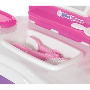 Um mini camarim para se produzir! Isso mesmo, com espelho, banquinho e diversos acessórios para brincar com a turma. Além do espelho que é retrátil (3 posições), a penteadeira vem com porta jóias, mini porta retrato e frascos de perfume para que a produção seja completa.
