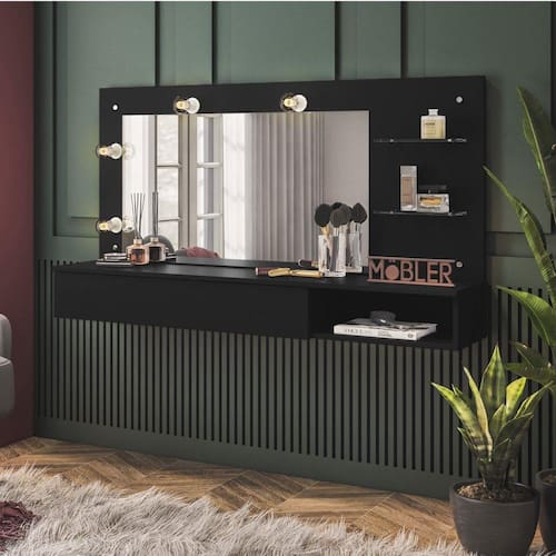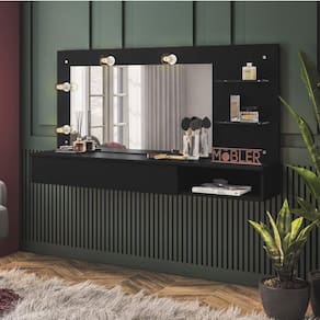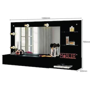 Para você que está em busca de um camarim funcional e prático, lógico, que é o que a Möbler mais investe, que é em beleza e muita qualidade, o Camarim Lumiere é tudo que você está procurando e muito mais. Este produto possui uma gaveta com corrediças telescópicas, utilizada pra melhor abertura e sustentação da mesma. Pensando em uma melhor iluminação para suas makes e fotos, esse produto possui um espelho e um kit com 4 soquetes para colocação de lâmpadas, duas prateleiras de vidro, que irão dar um charme exuberante em seus objetos decorativos, e para finalizar 4 lindos pinos cromados decorativos. Acabamento: Finish Foil Acabamento da Gaveta: Finish Foil Acabamento da Prateleira: Vidro Altura: 76,5 cm Ambiente Principal: Quarto calculo: unidade Complexidade da Montagem: Média: pode ser montado por mais de uma pessoa e/ou necessite de maior conhecimento para montagem Cr: Preto Fosco Liso Cr do Produto: Preto Fosco Liso Cr Flex: Não Cr Interna: Preto Escala de Brilho: Fosco Escala de Brilho da Gaveta: Fosco Escala de Brilho da Prateleira: Semi-Brilho Estilo: Moderno Formato: Quadrada Gaveta com Chave: Não Itens Inclusos: 1 Escrivaninha Lumiere, Kit Ferragens e Manual de Montagem Largura: 135 cm Linha ou Coleção: Glamour Manual de Montagem e Instalação: https://cdn2.madeiramadeira.com.br/atributo/mobler/764898-3003031-camarim-susp-lumiere-esquema-de-montagem-160-projeto-08-03-2021-tradu-o.pdf Material da Gaveta: MDP Material da Prateleira: Vidro Material Principal: MDP Montagem Flex: Não Necessita Montagem: Sim Origem do Produto: Nacional Peso: 29,6 kg Peso Máximo por Gaveta: 10 kg Peso Máximo por Prateleira: 5 kg Possui Gavetas: 01 Possui Passa Cabos: Não Possui Pés: Suspenso Possui Porta Objetos: Sim Possui Portas: Não Possui Prateleiras: 01 Possui Rodízio: Não Possui suporte para CPU: Não Possui Suporte para Teclado: Não Profundidade: 30 cm Quantidade de Nichos: 04 Recomendações de Uso, Manutenção e Limpeza: Para conservar a aparência e a durabilidade do produto: - Utilizar pano macio e úmido; - Não usar solventes ou abrasivos. Sapatas Niveladoras: Não Sistema de Montagem: Parafusos/Cavilhas status-cadastro: Aprovado Suporta Até (kg): 30 kg Tamanho: Tipo de Corrediça da Gaveta: Metálica Telescópica Tipo de Puxador da Gaveta: Embutido