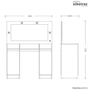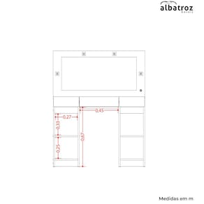 Características do Produto: Marca: Albatroz Modelo: Studio Material do Produto: MDP Material da Porta: MDP Tipo de Pintura: Pintura UV Acabamento da Pintura: Fosco Material do Puxador: Pega Que Dispensa o Puxador Tipo de Gaveta: Externa Tipo de Corrediça: Telescópicas -gaveta Central- Metálicas nas Laterais Tipo de Porta: Bater Tipo de Dobradiça: Metálica Material dos Pés: MDP Possui Gavetas: Sim Q. de Gavetas: 3 Possui Portas: Sim Q. de Portas: 2 Possui Prateleiras: Sim Q. de Prateleiras: 2 Peso Suportado Pelas Gavetas -kg-: 5 Possui Iluminação: Sim Possui Espelho: Sim Necessita Montagem: Sim Complexidade de Montagem: Alta Complexidade. Recomendasse a Contratação de Montador Profissional. Manutenção e Limpeza: Limpar Com Flanela ou Pano Macio Seco, Não Utilizar Produtos Abrasivos, Desengordurantes, Álcool ou Solvente. Não Expor o Produto Diretamente à Luz Solar e à Umidade.