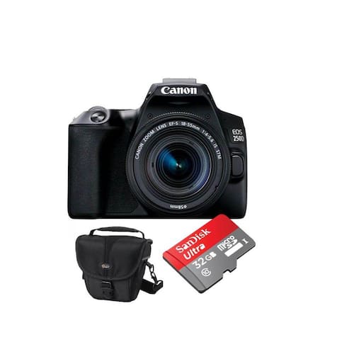Câmera Fotográfica EOS 250D e Lente 18-55mm Canon Preta A Câmera EOS 250D da Canon é uma DSLR leve e versátil que apresenta um sensor de 24,1 megapixels, processador de imagem DIGIC 8 para excelentes capturas de foto e vídeo em alta resolução, nitidez e clareza de imagens, conectividade wi-fi e bluetooth para o fácil compartilhamento de conteúdo quando emparelhada com seus dispositivos móveis, ecrã tátil de ângulo variável para melhor desempenho e enquadramento, bem como a versatilidade da objetiva 18-55mm que oferece estabilização de imagem para fotografias e vídeo, elemento asférico de alta precisão para reduzir distorções cromáticas em toda a faixa de zoom e proporcionar os melhores resultados. Especificações: Cor: Preta Marca: Canon Relação de aspecto: 3:2 Temperatura operacional: 0 – 40 °C Dimensões: 122,4 x 92,6 x 69,8 mm Sensor: CMOS de 22,3 mm x 14,9 mm Pixels Efetivos: Aprox. 24,10 megapixels Total pixels: Aprox. 25,80 megapixels Filtro "Low-Pass": Incorporado/fixo Sistema de limpeza integrado EOS Tipo do Filtro de Cores: Cor primária bateria de íons de lítio recarregável LP-E17 Especificações Objetiva Tamanho de Filtro: 58mm Ajuste do Foco: Sistema de focagem interno Construção da Lente: 13 elementos em 11 grupos Alcance Focal e Abertura Máx.: 18-55mm 1:3.5-5.6 Ângulo de Observação Diagonal: 74°20' - 27°50' Distância Focal mais Próxima: 0.82 pés / 0.25m Dimensões: 69.0 x 75.2mm, aprox. Itens Inclusos: 1x Bateria 1x Cabo de energia 1x EOS 250D Canon 1x Manual do usuário 1x Carregador 1x Alça de ombro 1x Objetiva 18-55mm Garantia: 90 dias Venda condicionada a existência de produto em estoque.