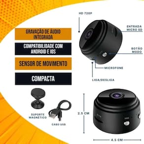 Características Design compacto e discreto Imagens em alta definição 1080p Conexão wi-fi para monitoramento remoto em tempo real Visão noturna para ambientes com pouca luz Base magnética para instalação prática Detecção de movimento com alerta no celular Compatível com ios e android Suporte para cartão micro sd até 128gb não incluso Funciona com ou sem wi-fi modo gravação local Ideal para uso residencial, comercial ou automotivo
