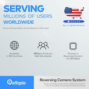 - O que você obtém: 1 câmera de backup, 2 suportes de metal, 1 cabo AV, 1 cabo de alimentação, 1 manual de instalação, garantia de dois anos e suporte técnico vitalício. O departamento de suporte da eRapta estará sempre disponível para qualquer consulta.
