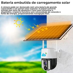 Principais Características: Resolução de 8MP Full HD: Captura de vídeo em alta definição, garantindo imagens claras e detalhadas.Painel Solar Integrado: Carregamento contínuo da bateria interna, permitindo uso prolongado sem conexão elétrica.Conectividade Wi-Fi de 2.4GHz: Conexão sem fio estável, facilitando a instalação e o acesso remoto.Detecção de Movimento PIR: A câmera é ativada automaticamente quando detecta movimento, iniciando a gravação e enviando alertas para o seu smartphone.Áudio Bidirecional: Comunicação em tempo real, permitindo que você fale e escute através da câmera, ideal para interações remotas.Visão Noturna Avançada: Monitoramento eficaz mesmo em condições de baixa luminosidade.Design Resistente ao Clima: Construção robusta que suporta diferentes condições climáticas, garantindo durabilidade e confiabilidade ao ar livre. Especificações Técnicas: Resolução: 8MP Full HDConectividade: Wi-Fi 2.4GHzDetecção de Movimento: Sensores PIR com notificação em tempo realÁudio: Bidirecional com microfone e alto-falante integradosAlimentação: Painel solar com bateria interna de grande capacidadeResistência: Construção resistente às intempéries, ideal para uso externoInstalação: Fácil instalação com suporte para montagem em diversas superfíciesEsta câmera é ideal para quem busca segurança e praticidade, com a vantagem de um sistema de energia autônomo e sustentável. Monitore sua casa ou empresa de qualquer lugar com a Câmera de Segurança IP Externa com Painel Solar e garanta proteção constante com alta qualidade de imagem e funcionalidade.