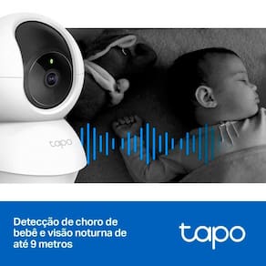 Detecção de choro de bebê com visão noturna avançada Seu segundo par de olhos e ouvidos Com visão noturna avançada, até 9 metros, e detecção de choro do bebê, a Câmera Tapo TC70 ajuda a cuidar do sono das crianças.