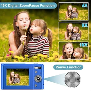 ?Zoom digital 16X e função de pausa?Esta câmera infantil para adolescentes suporta zoom digital 16x, que pode ampliar fotos e vídeos. A câmera infantil para meninas, meninos e adultos também tem uma função de pausa. Você pode pressionar o botão “OK” para pausar ao gravar ou reproduzir um vídeo. A luz de preenchimento embutida pode ajudá-lo a tirar fotos de alta qualidade no escuro. A interface externa do tripé pode ser instalada com um tripé para ajudar a estabilizar a filmagem.