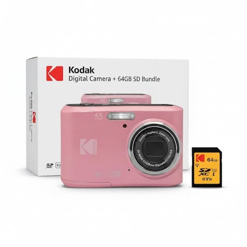 - Kodak PixPro FZ45 Friendly Zoom 16MP 1080p (rosa pastel) e cartão de memória Kodak 64GB Classe 10 UHS-I U1 SDXC