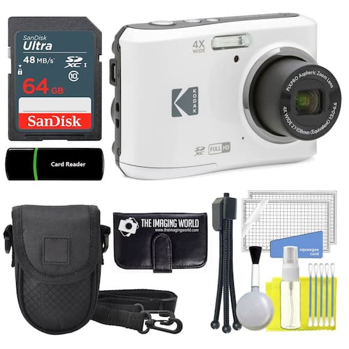 A câmera digital Pixpro FZ45 da Kodak é um pequeno ponto e disparo e um dos modelos de zoom amigáveis da coleção de câmeras digitais Kodak Pixpro. Pequena e fácil de usar, esta câmera é a escolha ideal para fotos em movimento. É convenientemente alimentado por duas pilhas AA e possui uma tela LCD de 2,7 polegadas, um zoom óptico de 4x, vídeo Full HD com um toque, remoção de olhos vermelhos, detecção de rosto e muito mais. - Inclui: Câmera digital Kodak Pixpro FZ45 (branca) + 2 pilhas alcalinas AA + cabo USB + alça de pulso + conjunto estendido: cartão de alta velocidade de 64 GB + leitor de cartão + carteira de cartão de memória + capa protetora + tripé de mesa e pacote de limpeza - Alimentado por 2 pilhas AA - tela LCD de 2,7 polegadas - Zoom óptico de 4x - lente grande-angular de 27 mm - Vídeo Full HD de 16 MP - 1080
