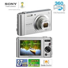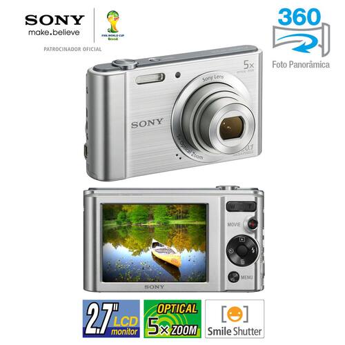 A nova Câmera Digital Sony DSC-W800 reúne praticidade e tecnologia em um corpo compacto e ultraleve. Com Sensor de Imagem de 20.1 Mega Pixels e Lentes Sony, registra imagens com cores vivas e ricas em detalhes. Grava vídeos em Alta Resolução HD com o simples toque de um botão, tudo para facilitar seus registros. Este modelo conta também com até 4 Tipos de Efeitos para Fotos, Panorâmicas e Vídeos além de Visor LCD de 2.7", Zoom Óptico de 5x e Estabilizador de Image.