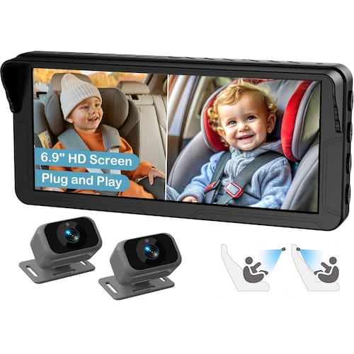 Dirigir com crianças no banco de trás pode ser estressante, mas com o sistema de câmera de carro duplo para bebê, você pode ter paz de espírito em cada viagem. O sistema vem com câmeras duplas, permitindo que você monitore seus bebês ou crianças ao mesmo tempo, sem a necessidade de alternar entre diferentes visualizações. A tela dividida de 6,9 polegadas é brilhante, clara e projetada para se adaptar às condições de iluminação do seu carro com seu ajuste automático de brilho. À noite, a tecnologia de visão noturna infravermelha garante que você possa ficar de olho nos seus pequenos sem perturbar o sono deles, tornando cada viagem noturna mais segura para pais e filhos. O sistema de câmera é projetado com compatibilidade universal, o que significa que funcionará com quase qualquer modelo de carro, e a instalação é rápida e sem ferramentas. Basta montar as câmeras e conectá-las. Além disso, a estrutura robusta do sistema garante que ele possa lidar com as demandas diárias da vida familiar, tornando-o um investimento confiável por muitos anos. Se você estiver dirigindo durante o dia ou à noite, em trânsito intenso ou em uma longa viagem, o sistema de câmera dupla para carro de bebê é seu parceiro confiável para manter seus filhos seguros e confortáveis. - Paz de espírito com câmera dupla: observe as duas crianças simultaneamente com o monitor de bebê com câmera dupla de carro. Ideal para ficar de olho em seus filhos enquanto dirige, proporcionando segurança incomparável e reduzindo a ansiedade dos pais na estrada - Tela dividida maior de 17.5 cm: Desfrute de uma visão clara e nítida com a tela LCD de tela dividida HD de 1080p. A tela personalizada de proporção 24:9 não bloqueia a visão do motorista. Vem com um para-sol para reduzir o brilho e garantir uma visualização clara sob luz solar intensa - Visão noturna superior para segurança 24 horas: muda automaticamente para visão noturna infravermelha sem luzes vermelhas agressivas, garantindo visibilidade clara em condições de pouca luz. O ajuste de brilho automático se adapta à mudança de luz, oferecendo clareza ideal para monitoramento diurno e noturno. Os pais podem monitorar facilmente as crianças mesmo no escuro - Fácil instalação, compatibilidade universal: a câmera do carro para bebês é projetada para instalação rápida e fácil sem a necessidade de nenhuma ferramenta. É compatível com quase todos os modelos de carros, minivans e SUVs, oferecendo uma solução sem complicações para famílias em movimento - Suporte com ventosa com melhor resistência ao calor: o suporte atualizado com ventosa foi projetado para máxima durabilidade e resistência ao calor, evitando que derreta ou caia em altas temperaturas. Mantém o monitor firmemente no lugar para monitoramento confiável - Ideal para veículos de 3 filas: o cabo de 6 x 5 m oferece amplo comprimento para posicionar as câmeras em veículos com várias fileiras de assentos, oferecendo posicionamento flexível para famílias com veículos de três fileiras - Opções de fonte de alimentação dupla para flexibilidade: equipada com um isqueiro e cabo de alimentação USB, a câmera dupla para carro de bebê pode ser alimentada por várias fontes, garantindo compatibilidade com vários tipos de veículos e configurações de carregamento - Fácil gerenciamento de cabos com clipes incluídos: mantenha seu veículo organizado e organizado com os clipes de gerenciamento de cabos incluídos que ajudam a proteger e esconder os cabos, evitando confusão e garantindo uma aparência limpa e profissional - Visão clara e ampla: com uma lente grande-angular de 150° para garantir que você possa ver todo o banco traseiro e o bebê claramente sem pontos cegos - Presente perfeito para novos pais: esta câmera de carro de bebê durável para 2 crianças é o presente perfeito para chá de bebê ou lista de presentes, amada pelos novos pais por sua camada adicional de segurança em viagens. Fique de olho no seu pequeno enquanto estiver na estrada