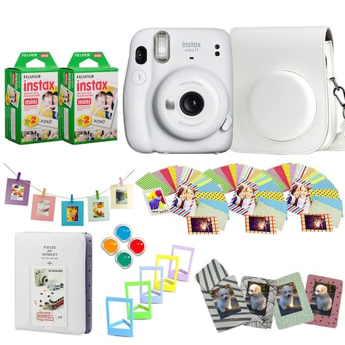 ENFEITE SUA CÂMERA — escolha entre um botão de joia ou um botão brilhante para dar um toque extra à sua câmera. O PACOTE INCLUI câmera, 40 folhas de filme Instax, estojo combinando, 5 molduras magnéticas, conjunto de filtros de 4 peças (vermelho, azul, verde, amarelo), álbum, conjunto de molduras suspensas de 10 peças, conjunto de molduras de mesa de 5 peças e 60 molduras adesivas para adicionar tempero e personalidade às suas fotos