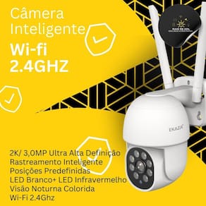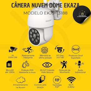 Modelo: EKJS-T3188 Resolução: 2K 2304x1296 Ângulo de visão: 135 graus Armazenamento: Cartão de memória de até 128GB não inclui cartão Rotação: 355 graus Áudio: Microfone embutido e alto-falante integrado Alimentação: DC 5V2A Certificação: ANATEL Ambiente operacional: Temperatura de 0 a 40 graus Umidade operacional: 10% a 90%, sem condensação Aplicativos: Ekaza, Android, Tuya, Smart Life e NovaDigital. Garantia: 12 meses contra defeitos de fabricação pela Ekaza