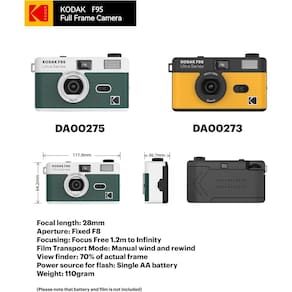 Formato do filme: 135 24 x 36 mm Compatível com filme iso 200/400/800 de 35 mm Possui uma lente de foco livre f8 de 28 mm Filme de carregamento fácil Velocidade do obturador de 1/120 seg. Proporção de visualização do visor: 70% Flash embutido Marca: Não Informado