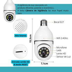Descrição do anúncio: A câmera lâmpada wi-fi ip de segurança é a solução ideal para monitorar a sua casa ou empresa. Com instalação fácil e rápida, basta conectá-la em um bocal de lâmpada comum. Oferece visão em tempo real, controle de movimentação e zoom pelo celular, além de luz e áudio bidirecional. Possui alta resolução full hd 1080p e detector de movimento que envia notificações diretamente para o seu celular.