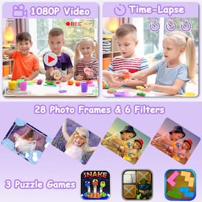 ?Câmera digital HD para crianças?A câmera infantil é equipada com 5,0 mega pixels e tela IPS HD 1080P. 28 molduras e 6 filtros podem ser escolhidos para ajudar as crianças a ter experiências diferentes de fotografar, tornando-a mais divertida. Em comparação com outras câmeras infantis, ela melhorou drasticamente a clareza da foto, oferecendo imagens e vídeos de alta qualidade. A câmera infantil foi projetada especialmente para meninos e meninas. ?Câmera infantil?Esta capa subaquática pode oferecer excelente proteção para a câmera contra arranhões e impactos. Câmera infantil Agoigo com o estojo instalado, você pode mergulhar na água até 98 pés. Perfeito para nadar, surfar, mergulhar, etc. Dicas importantes: Não abra a caixa à prova d'água embaixo d'água. A câmera está selada em uma caixa à prova d'água e não pode gravar som. ?Câmera infantil multifuncional?Câmeras digitais infantis com mais funções, aplicáveis à captura de fotos/gravação/reprodução de vídeo para crianças, captura retardada, configuração de data, etc. Nota: A lente da câmera é de lente única. Bateria de lítio recarregável de 600mAh com capacidade embutida, pode ser usada por 2-3 horas, desligamento automático se não houver operação para preservar a vida útil da bateria. 32GB de alta capacidade, permite armazenar milhares de fotos. ?Melhor presente para crianças?Esta câmera também é uma boa parceira para a vida diária de crianças ou viagens de férias. As câmeras infantis são ótimos presentes de aniversário, presentes de Natal e presentes de Natal para meninos e meninas de 3 a 12 anos. A câmera digital infantil é extremamente fofa, pequena e leve. Após o serviço, qualquer problema com nossa câmera infantil, sinta-se à vontade para entrar em contato. -?Câmera digital infantil?A câmera infantil é equipada com 5,0 mega pixels e vídeo HD 1080p, design de tela de 2 polegadas. 28 molduras e 6 filtros podem ser escolhidos para ajudar as crianças a ter experiências diferentes de fotografar, tornando-a mais divertida. Em comparação com outras câmeras infantis, ela melhorou drasticamente a clareza da foto, oferecendo imagens e vídeos de alta qualidade. A câmera infantil foi projetada especialmente para meninos e meninas. -?Câmera infantil?Esta capa subaquática pode oferecer excelente proteção para a câmera contra arranhões e impactos. Câmera infantil Agoigo com o estojo instalado, você pode mergulhar na água até 98 pés. Perfeito para nadar, surfar, mergulhar, etc. Dicas importantes: Não abra a caixa à prova d'água embaixo d'água. A câmera está selada em uma caixa à prova d'água e não pode gravar som. -?Câmera infantil multifuncional recarregável e cartão SD de 32 GB?Câmeras digitais infantis com mais funções, aplicáveis a captura de fotos/gravação/reprodução de vídeo para crianças, captura retardada, configuração de data, etc. Nota: A lente da câmera é de lente única. Bateria de lítio recarregável de 600mAh com capacidade embutida, pode ser usada por 2-3 horas, desligamento automático se não houver operação para preservar a vida útil da bateria. 32GB de alta capacidade, permite armazenar milhares de fotos. -?Melhor câmera de presente para crianças?Esta câmera também é uma boa parceira para a vida diária de crianças ou viagens de férias. As câmeras infantis são ótimos presentes de aniversário, presentes de Natal e presentes de Natal para meninos e meninas de 3 a 12 anos. A câmera digital infantil é extremamente fofa, pequena e leve. Com a opção de vídeo na gravação, explore a criatividade de seus filhos. -?Outros acessórios e serviços pós-venda?Kits de montagem versáteis que permitem que a câmera infantil seja fixada em qualquer superfície plana (skates, capacetes) e bicicletas. O pacote inclui um cordão durável para as crianças pendurarem a câmera no pescoço e levarem para qualquer lugar. Após o serviço, qualquer problema com nossa câmera infantil, sinta-se à vontade para entrar em contato.