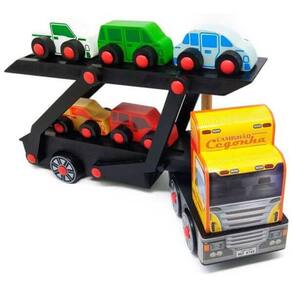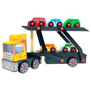 Seu Caminhão Cegonha de Madeira - Carimbras vem com 05 carrinhos para você transportar. Viaje com cuidado e quando chegar ao destino final, desça a parte superior até a superfície para retirar os carrinhos.