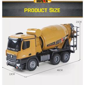 CAMINHÃO BETONEIRA DE CONTROLE REMOTO HUINA 1574 - Escala 1/14- Excelente qualidade, com várias funções igual ao real;- Emite som do motor em funcionamento, seta, bip de marcha ré;- Ascende os faróis dianteiro e traseiro;- Rotação do tambor horário e anti-horário;- Tração integral nos 2 eixos traseiros e pneus de borracha;ESPECIFICAÇÕES:Marca: Huina;Modelo; 1574;Escala: 1/14;Cor: Amarelo;Material principal: Plástico;Sistema de rádio: 2.4ghz;Canal: 10CH;Distância de controle: aproximadamente 50 metros;Tempo de carregamento: aproximadamente 240 minutos;Autonomia da bateria: 15 à 20 minutos;Bateria: 7.2v 400mah;Pilhas para o controle remoto: 4x AA (não Incluso);Tamanho do carro: 47cm (C) x 22.5cm (A) x 15cm (L)Peso do carro: 2.750gCARACTERÍSTICAS:- Funções: Mover para a frente/para trás, virar à esquerda/direita, rotação do tambor horário e anti-horário, luz e som;- Ao mover-se para a frente/para trás, as luzes na frente e de trás serão ligadas automaticamente;- Simule o trabalho de caminhão betoneira real, e assim exerça a capacidade de coordenação das crianças e adultos;- Brinquedo inspirador e rico em detalhes, ideal para quem é apaixonado por caminhões!CONTEÚDO:1x Caminhão Betoneira 1574 - Mixer Truck HUINA;1x Controle 2.4ghz 10 canais;1x Bateria recarregável NI-CD 7.2v 400mah1x Cabo carregador USB; Marca: Huina Ean: 0757347918474