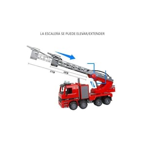 O caminhão bombeiro lança água, tem um compartimento em sua parte superior para ser carregado com água e um botão que quando pressionado faz a descarga através da mangueira. A escada se expande e contrai, sobe e desce (manualmente) e tem uma rotação de 360°, o caminhão não tem atrito e suas medidas são 42 cm de comprimento, 19 cm de altura e 12 cm de largura. Idade recomendada: 3 ou mais