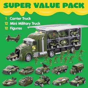 - SUPER VALUE. Conjunto de 12 mini caminhões militares em diferentes designs e funções em um caminhão transportador. Incluindo 12 com figuras de soldados de plástico, helicópteros, tanque, carro blindado, caminhão longo, hovercraft, caminhonete e assim por diante.