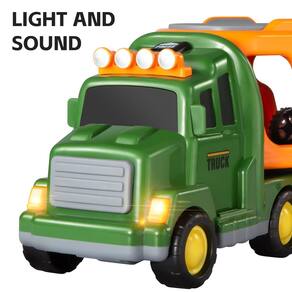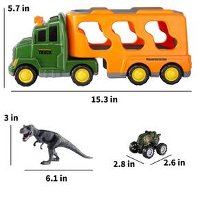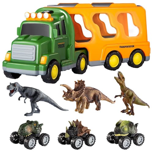 TEMI Brinquedos de caminhão de dinossauros para meninos e crianças de 3 a 5 anos, carro de transporte com 3 bonecos de dinossauro e 3 carros monstros, veículo de brinquedo de fricção com luz e som, conjunto de presentes para crianças pequenas - Pacote econômico colorido 7 em 1: o brinquedo de caminhão de dinossauro TEMI (39 x 11 x 14,5 cm) inclui 3 bonecos de dinossauro maiores e 3 carros dinossauros de fricção (Tiranossauro Rex, Tricerátopo, Giganotossauro). As figuras de dinossauro fazem os dinossauros parecerem vívidos e adequados para as mãos das crianças - Fácil para crianças: as superfícies são lisas e não têm bordas afiadas, o que não machuca a pele das crianças. O caminhão tem 8 rodas grandes que o tornam mais estável para a corrida alimentada por fricção e divertido para seus filhos na hora de brincar. Bons brinquedos educativos para crianças - Atrito, giratório e removível: empurre o caminhão e ele pode carregar dinossauros para ir! A cabeça do grande transportador pode girar. Depois de alcançar, separe a cabine e o compartimento de tração e, em seguida, abra a porta traseira para transportar dinossauros e veículos para baixo - Luz e som: pressione o botão na parte superior da cabine e as crianças podem ouvir o som do carro e ver as luzes brilhantes piscando. Toda vez que você pressionar o botão, o som durará apenas cerca de 10 segundos, não se preocupe em fazer barulho - Brincar e aprender: este conjunto de caminhões de transporte faz com que as crianças se tornem um excelente motorista para aprender sobre dinossauros. Muito adequado para ideias de presentes educativos iniciais para brinquedos de viagem, presentes de festivais, presentes de Natal para meninos e meninas de 3, 4, 5, 6 anos de idade