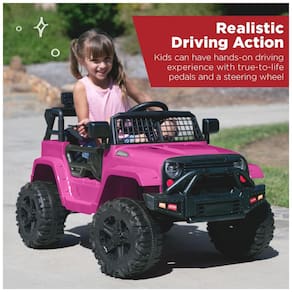 Este incrível caminhão elétrico é ideal para crianças a partir de 3 anos que desejam dirigir como os adultos! Possui design realista de 12V com cinto de segurança ajustável, faróis de LED brilhantes, portas traváveis e para-brisa gradeado para um estilo off-road. Com motor de 12V e pneus de tração, permite passeios suaves em diferentes terrenos. Seu filho pode dirigir manualmente ou ser guiado com segurança através do controle remoto pelos pais, com controle de direção frente e ré. Possui rodas de plástico que nunca murcham, sistema de suspensão de molas e velocidade máxima de 2,8mph para aventuras ao ar livre. Além disso, conta com uma saída AUX embutida que permite às crianças conectar dispositivos de mídia para dirigir ao som de sua própria música. Dimensões totais: 99,69cm x 66,04cm x 66,04cm. Capacidade de peso: 27,67kg.