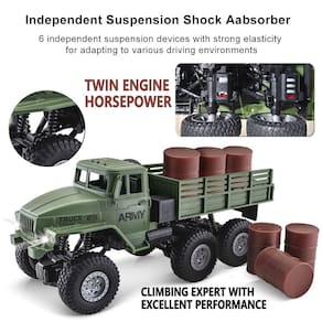 Feito de plástico ABS de alta qualidade e material de PVC não tóxico, à prova de explosão, este carro é seguro para crianças. Perfeito para crianças como presentes de Natal, aniversário e dia das crianças. - ? Brinquedos de simulação do exército ? Alta simulação da estrutura real de caminhão militar. Pneu a vácuo de borracha real. Simulando o design autêntico de lâmpada dupla do caminhão, as lâmpadas LED frontais fornecem luzes suficientes para operar o caminhão à noite ou em locais escuros. - ?Fácil de controlar?A poderosa capacidade de tração nas 4 rodas aumenta a capacidade dos veículos de controle remoto de viajar em condições adversas da estrada. Equipado com amortecedores de metal e pneus antiderrapantes, o que torna o carro mais estável e fácil de operar. O controle remoto usa o sistema de transmissão de sinal de 2,4 GHz, suporta vários carros jogando ao mesmo tempo. - ?Adequado para crianças?Caminhões militares 1/16 All Terrain RC com capacidade, tem uma forte capacidade de escalar no gramado, na praia e nas rochas e outros terrenos complexos. A velocidade de 10-15 km/h é adequada para crianças. Até crianças com mais de 3 anos podem dirigir o caminhão facilmente. - ?2 conjuntos de baterias para brincadeiras longas? Tempo de brincar. Economize o trabalho de carregar frequentemente, mais diversão para seus filhos. As crianças brincam mais e os pais têm mais tempo para descansar. Pneus antiderrapantes grandes, com rodas, 4WD e equipados com molas independentes, luzes LED frias, oferecem boa capacidade de direção total, proporcionando a liberdade de dirigir onde você quiser dirigir na areia, grama e outras condições que não seriam possíveis antes. - ?Segurança e presente?Dimensões: 31 x 14 x 12,7 cm; Feito de plástico ABS de alta qualidade e material de PVC não tóxico, à prova de explosão, este carro é seguro para crianças. Perfeito para crianças como presentes de Natal, aniversário e dia das crianças.
