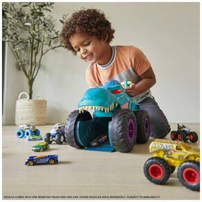 O Hot Wheels Monster Trucks Car Chompin Mega Wrex é um veículo gigante que ganha vida com luzes e sons. Ao empurrar sua cauda, ele come carros fundidos em escala 1:64 e Monster Trucks Hot Wheels. Este conjunto de monster truck é perfeito para crianças de 3 anos ou mais que querem experimentar a emoção de colisões e diversão. Além disso, depois de devorar os veículos, o Mega Wrex os faz cocô O conjunto inclui um carro fundido Hot Wheels e é vendido separadamente, sujeito a disponibilidade. Com o Mega Wrex, as crianças podem dar vida ao seu monstro favorito enquanto ele ataca os carros e caminhões em seu caminho. Aumente a imaginação e a narrativa com Monster Trucks exclusivos que oferecem recursos alucinantes.
