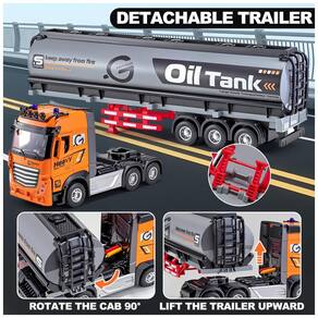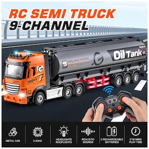 Este Caminhão Tanque de Óleo possui cabine de metal, corpo de plástico ABS, pneus de borracha real. Com 9 canais, oferece movimentos avançar, retroceder, virar à esquerda e à direita, luzes dianteiras e no teto, som realista, aumento e redução de velocidade, além de demonstração automática. Funciona com controle remoto 2.4GHz, com alcance de até 20 metros e pouca interferência. A cabine pode ser destacada do reboque, permitindo maior velocidade. Certificado de segurança ASTM, ideal para crianças a partir de 3 anos. Inclui duas baterias recarregáveis de alta qualidade para até 230 minutos de diversão contínua. Perfeito para presente de aniversário ou qualquer ocasião.