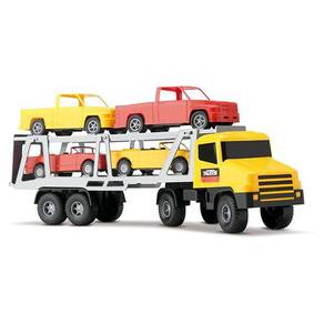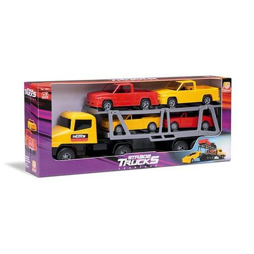 Uma Super Cegonheira que transporta 4 veículos que vão proporcionar muitas aventuras A rampa superior da cegonheira sobe e desce para descarregar os carros, a porta de trás desce para formar uma rampa.