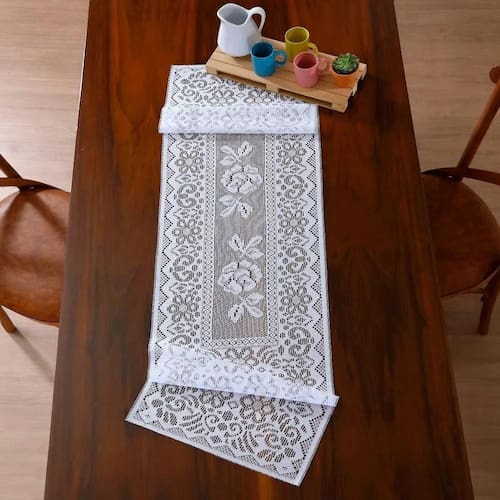 Caminho de Mesa de Renda 40x150cm Valência Branca Interlar O trilho de mesa Valência medindo 0,40m x 1,50m tem lindos detalhes em flores com um design moderno, um item que não pode faltar na decoração da sua mesa e trazer um toque especial ao ambiente, que fica mais leve e inspirador. Produzido com material de qualidade confeccionada em 100% poliéster, que vai encantar você e seus convidados.