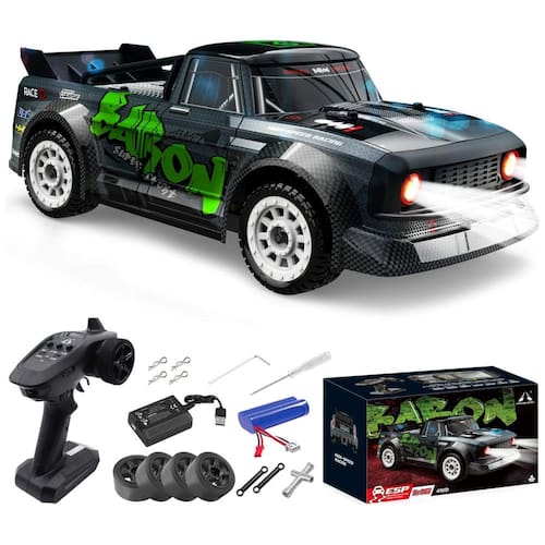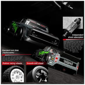4 rodas motrizes de alta velocidade Equipado com sistema 4WD e motores potentes, este carro tem forte potência e força motriz, sua velocidade atingirá até 20 MPH 30 KM, H, proporcionará uma ótima experiência de corrida. Controle Remoto de 2,4 Ghz A frequência do controle remoto é de 2,4 Ghz, possui longa distância de controle alcance 160 pés boa capacidade anti jamming, adequada para mais carros trabalharem ao mesmo tempo sem interferência, as crianças brincando com os brinquedos juntos terão mais alegria . Controle Proporcional de Aceleração e Direção Existe a função de controle proporcional de aceleração e direção no sensível sistema de controle remoto, os jogadores têm condições de controlar as velocidades e afinar a direção pelo controlador. Ele fornece mais operabilidade e métodos de reprodução. Materiais de alta qualidade o carro tem corpo de plástico de alta qualidade e pneus de borracha, é muito firme e durável. As molas estáveis e os eixos de transmissão são feitos de metal, são extremamente duros e resistentes a impactos. Ele vem com 2 conjuntos de pneus, os pneus de rally são adequados para atividades ao ar livre, outros são para drifting em ambientes fechados