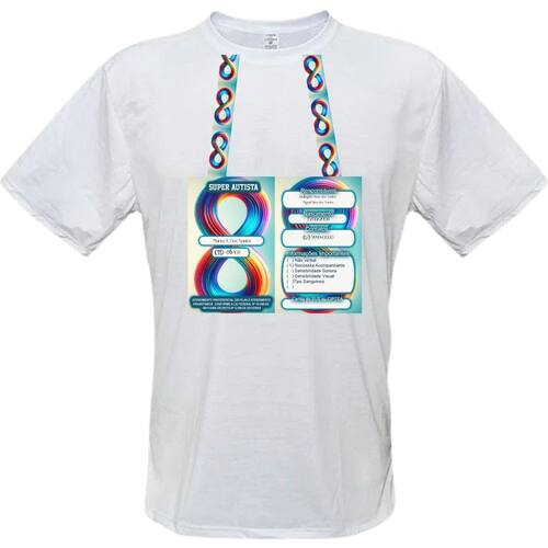 A camiseta é confeccionada em tecido confortável, leve e com caimento ideal para uso prolongado, perfeita para o uso em casa, na escola, em terapias ou durante passeios. Sua estampa exclusiva na parte frontal simula um cordão de identificação, onde estão destacados campos essenciais como nome, CID, contatos de emergência e informações importantes sobre a pessoa. Esses campos podem ser preenchidos com caneta de tecido permanente, permitindo uma personalização segura e duradoura, feita especialmente para as necessidades de cada criança ou adulto atípico.