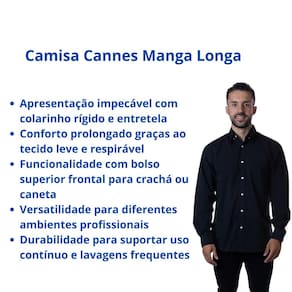 A camisa Cannes manga longa é perfeita para uniformes sociais que unem estilo e praticidade. Seu colarinho rígido com entretela garante apresentação sempre alinhada, enquanto o tecido leve e as mangas longas oferecem conforto em qualquer estação.