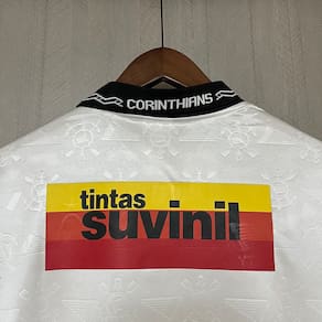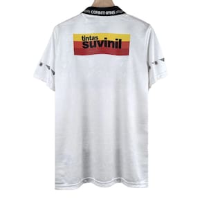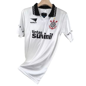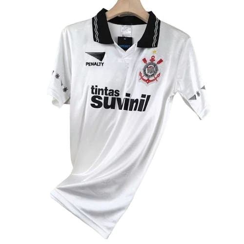 Produto: Camisa Corinthians 1995 Retrô Cor: Branco Gola: V Canelada em Branco Escudo: Bordado à Esquerda do Peito Patrocínio: Sim Tecido: Respirável e Leve Modelagem: Tradicional