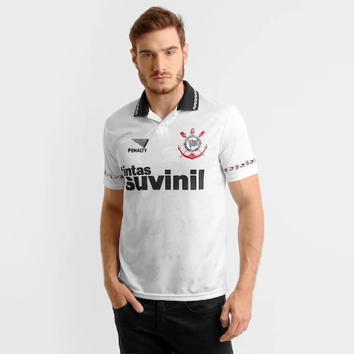 Produto: Camisa Corinthians 1995 Retrô Cor: Branco Gola: V Canelada em Branco Escudo: Bordado à Esquerda do Peito Patrocínio: Sim Tecido: Respirável e Leve Modelagem: Tradicional