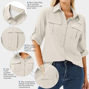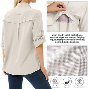 Prepare-se para suas aventuras ao ar livre com nossas camisetas de pesca versáteis para mulheres. Se você estiver planejando uma viagem ou explorando o deserto, nossas camisetas de viagem para mulheres oferecem a combinação perfeita de conforto e estilo. Feitas de tecidos de secagem rápida e respiráveis, nossas camisetas safári para mulheres são projetadas para manter você fresca e protegida em vários climas. Estas camisetas femininas de manga comprida oferecem proteção solar FPS 50, protegendo você de raios prejudiciais. Elas são as roupas de viagem ideais para mulheres que valorizam tanto a moda quanto a funcionalidade. Fique confortável e organizado com nossas camisetas femininas de secagem rápida. Projetadas com utilidade em mente, essas roupas essenciais para uso ao ar livre apresentam vários bolsos, incluindo dois bolsos no peito com fechos seguros. Nossas blusas femininas de caminhada são feitas para suportar os rigores do ar livre. Se você estiver indo para trilhas ou embarcando em uma aventura de safári, estas camisetas de manga comprida para mulheres manterão você preparada e elegante. Experimente a melhor versatilidade com nossa camiseta feminina de caminhada. Feitas com materiais leves e absorventes de umidade, estas blusas femininas mantêm você fresca e seca durante suas atividades ao ar livre. Nossas camisetas femininas de manga comprida podem ser convertidas em mangas curtas, oferecendo adaptabilidade para mudanças nas condições climáticas. Se você estiver caminhando, acampando ou simplesmente desfrutando de um passeio de lazer, nossas camisetas femininas de secagem rápida são a escolha perfeita. Atualize seu guarda-roupa com nossa coleção de blusas femininas de manga comprida. Estas blusas elegantes são perfeitas para aventuras ao ar livre e uso diário. Feitas de materiais de alta qualidade, nossas roupas femininas de verão são projetadas para manter você confortável em climas quentes. De passeios casuais a ambientes de trabalho, nossas roupas de trabalho femininas oferecem o equilíbrio perfeito entre profissionalismo e funcionalidade. Estas blusas femininas de manga comprida são peças versáteis que podem ser combinadas com várias calças para diferentes ocasiões. - Respirável e de secagem rápida: tecido de poliéster de qualidade leve e de secagem rápida absorve a umidade do corpo para manter você confortável e seco o dia todo. Não se preocupe com o problema de molhar a umidade. A superfície do tecido é resistente a manchas, fácil de manter. - Proteção solar: o tecido UPF 50+ oferece máxima proteção solar contra raios ultravioleta prejudiciais e reduz sua exposição à radiação UVA/UVB prejudicial, quando você está pescando, escalando ou viajando. - Camisetas de caminhada de manga longa: as camisetas femininas leves de safári apresentam uma parte traseira ventilada forrada de malha para respirabilidade e conforto. Mangas dobráveis para converter mangas compridas em mangas curtas para dias quentes. - Roupas de safári para mulheres: a camisa feminina de botão de manga comprida possui dois bolsos práticos no peito para armazenamento e um gancho de óculos de sol acima do bolso esquerdo. - Camisa de pesca feminina:: camisas de secagem rápida para uso casual e recreativo ao ar livre, como caminhadas, caça, viagens, acampamento, pesca, montanhismo, ciclismo, e adequadas para primavera/verão/outono.