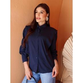 Camisa Feminina Alfaiataria Office Lisa Manga Longa Recorte - Azul Marinho - G