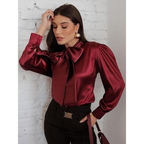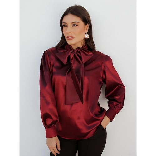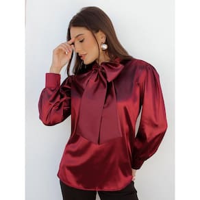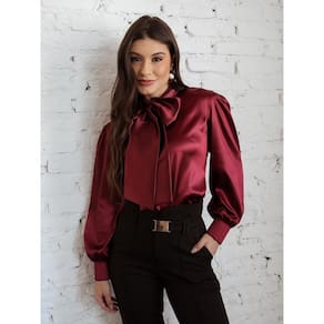 Camisa Feminina Cetim com Laço Grande Decote Manga Longa - Vermelho - G
