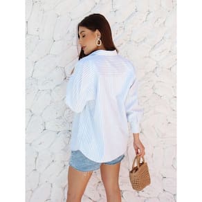 Camisa Feminina Listrada Clássica Manga Longa Alfaiataria - Azul Claro - GG