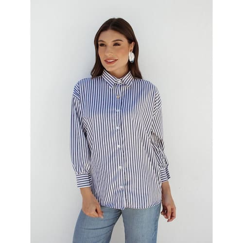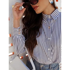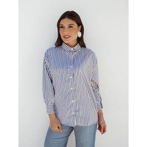 Camisa Feminina Listrada Clássica Manga Longa Alfaiataria - Azul Marinho - M