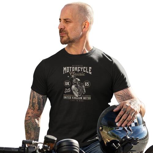Camiseta com ilustração detalhada de uma motocicleta clássica, inspirada no modelo UK 65, trazendo referências vintage e um visual marcante. Ideal para quem curte motos, cultura urbana e um estilo único.