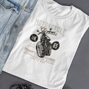 Camiseta com ilustração detalhada de uma motocicleta clássica, inspirada no modelo UK 65, trazendo referências vintage e um visual marcante. Ideal para quem curte motos, cultura urbana e um estilo único.