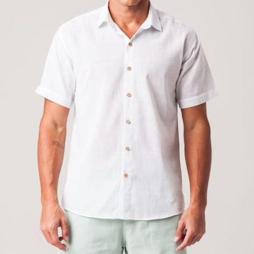 A camisa social masculina slim conta com gola esporte, abotoamento frontal e mangas curtas.