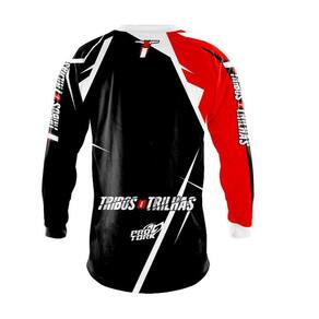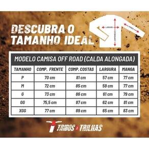 A Camisa Motocross Tribos e Trilhas é confeccionada em poliéster 100%, leve e confortável. Feita com grafismos sublimados, gola V, etiqueta de identificação em termo-transferência e cauda alongada, que evita que saia de dentro da calça.
