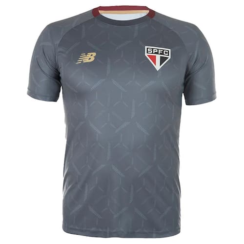 - Detalhamento: Camiseta manga curta, gola careca, logo New Balance na altura do peito ao lado direito, distintivo do SP na altura do peito ao lado esquerdo, caimento padrão, modelo treino, NB Dry;
