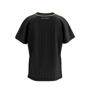 Raglan com vivos contrastante na gola, criando uma combinação black and gold. A peça apresenta estampa do escudo centralizado, uma tendência no universo esportivo.